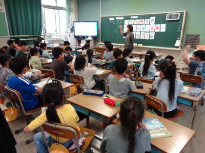 英語の授業中です。好きなものを聞く活動に取り組んでいます。