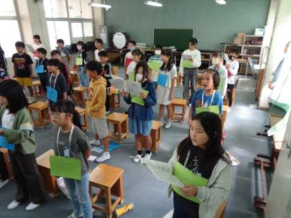 最初は、パートごとに教室と音楽室で別れて練習し、後半に全員で歌う練習をしました。