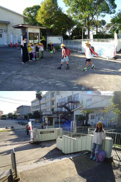 今日は、1年2組の子どもたちと児童会の子どもがあいさつ運動に立っています。