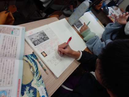 6年生 ペリー来航 公開日 2024/11/19 更新日 2024/11/19 6年 社会科の授業中です。 ペリー来航の話を聞いています。当時のことを思い浮かべながら、先生の話を聞いています。子どものノートを少しのぞいてみると、黒板に書かれたことを書き写すだけではなく、先生の話した内容で、頭に残ったことを行間にびっしりと書きこんでいる子どもがいました!しっかりと聞いてくれて、うれしいですね!