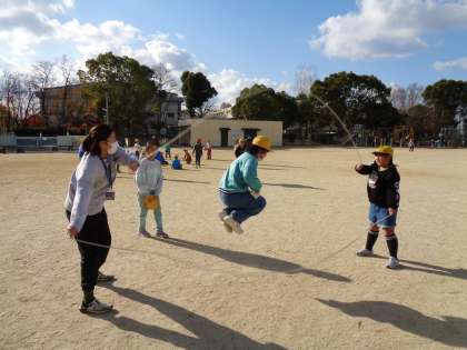 ダブルダッチに挑戦しています!なわを回すことすらも難しいダブルダッチですが、5年生の子どもが、なんと15回も跳んでいました。すごい!今までに経験はないそうで、びっくりしました。