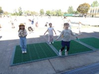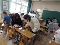 職員室前の廊下に掲示されている作品を見て、話し合っている子どもがいます。外へ行く途中のようでしたが、気になったようです。違う学年・学級の作品を見ることも楽しいですね。