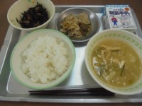 5/30(金)今日の献立は、ごはん牛乳みそ汁豚肉の生姜焼きひじきの甘煮でした。学...