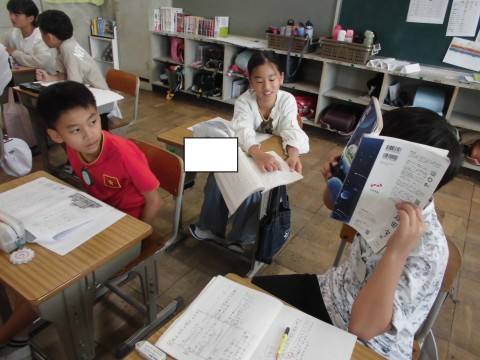 <3枚目>国語の学習です。文のどこから主人公の心情が読み取れるかをグループで話し合っています。