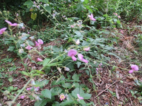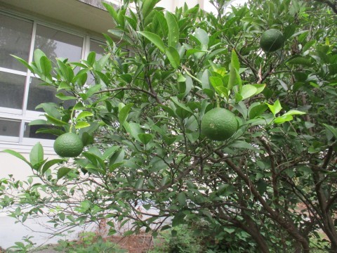中庭では萩の花が咲き、みかんの木には青い実がなっています。
