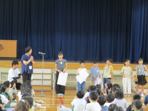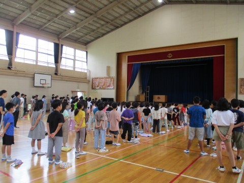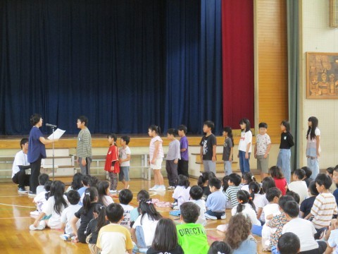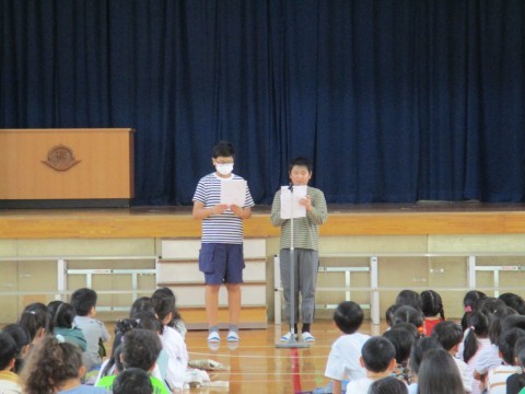 校長先生からはお月見のお話と「桃小コミュニティフェスタ」の来場者アンケートの紹介、生徒指導の先生からは学校帰りに寄り道して遊ぶことはやめようというお話がありました。
