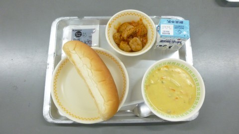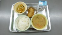 今日の給食には、目を保護する「ビタミンA」のもととなる栄養素や、目の疲れをとれやすくする「アントシアニン」をたくさん含む食品を使っています。