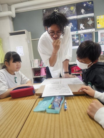 <1枚目>総合の時間です。今日は、パフェ屋の店主さんに来ていただいて、食プロジェクトの話を聞かせていただきました。みんな興味津々に聞いていました。