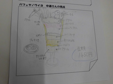 <2枚目>「実際にパフェを考えてみよう!」という活動をしました。何をどこに置くか、相談しながら考えています。