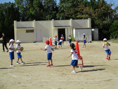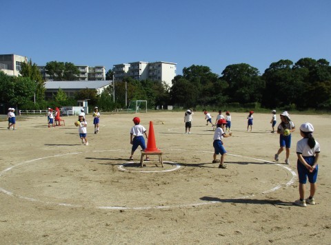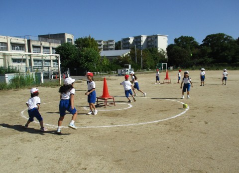 秋晴れの空のもと、ボールを使ったゲームに取り組みました。