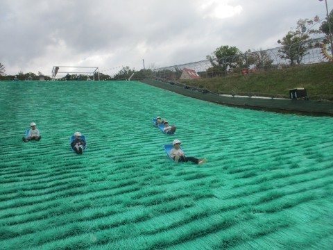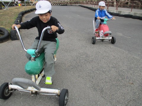 ハーベストの丘にて,ソリに乗って芝をすべったり,いろいろな形の自転車に乗ったり,羊のえさやりをしたり,たくさんの体験をしました。