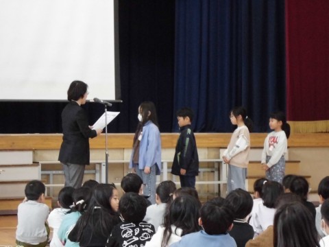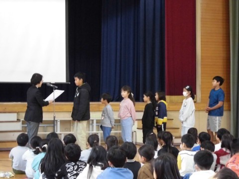 今日はたくさんの児童が表彰されていました。さかいっこ作文、連合運動会、はとぶえコンクール、幼小中美術展の表彰がありました。