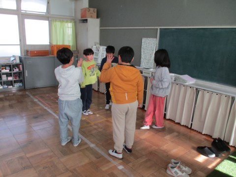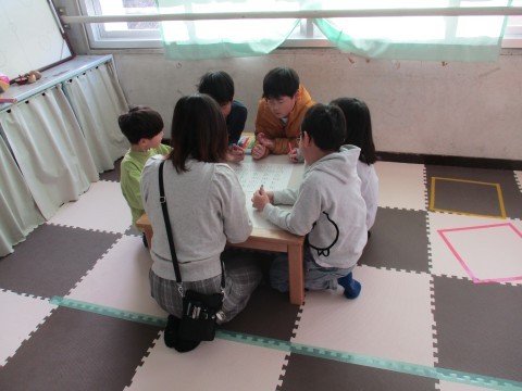 今日は36マスゲームをしました。さいころを振って、出た目のところの課題に挑戦します。できていたかを子どもたちどうしで話し合い、判定しながら進めていました。