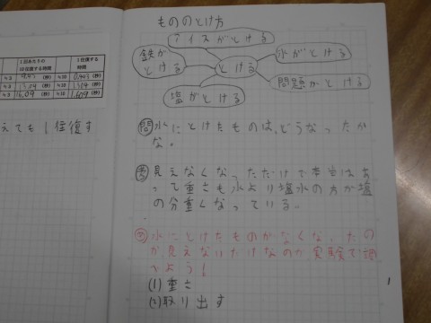 <2枚目>理科の学習です。「もののとけかた」で「とける」ものを考えました。そのあと,水に溶けたものはどうなるのかを考えています。見やすいノートを発見しました!