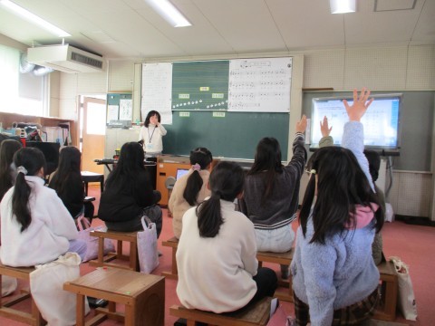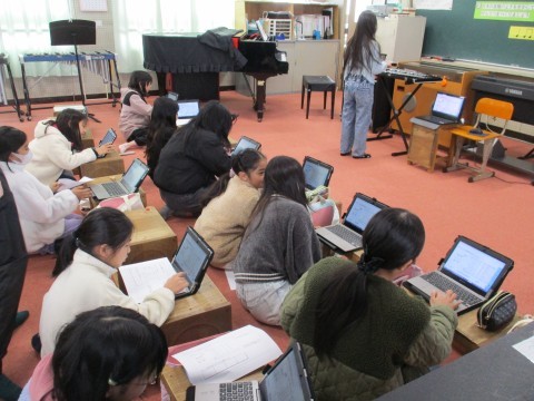 西洋音階と日本音階の違いについて学習した後、児童用PCを使って、個人でそれぞれ日本音階で2小節の曲作りに挑戦しました。
