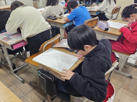 <2枚目>図工の学習です。版画の下書きをしています。来週から掘り進める予定です。怪我無く進めていきたいです。