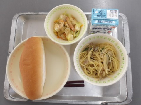 牛乳 和風スパゲッティ 豆腐サラダ ミニコッペパン です。