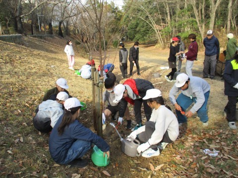 桃山台校区連合自治会の皆様とともに、西原公園に桜の木を2本植樹しました。