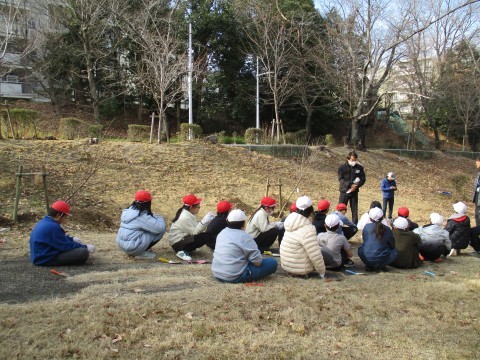 スコップで木の周りにきれいに土手を作り、水で固めました。冬の間は乾燥するので、水やりをしっかりして桜を育ててほしいと連合会長さんから5年生にお話がありました。
