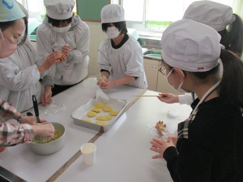 家庭科の調理実習で、さつまいもを使ってスイートポテトを作りました。