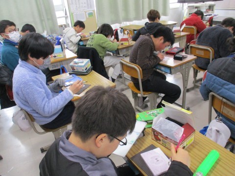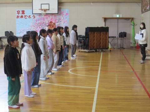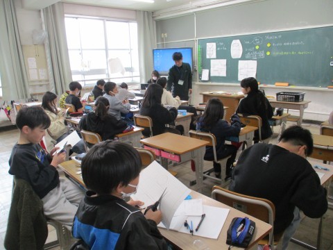 3年生は理科で糸電話の実験、4年生はお別れ会の練習、5年生は算数で円柱の学習、6年生は図工で卒業制作をしていました。