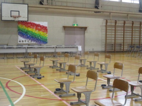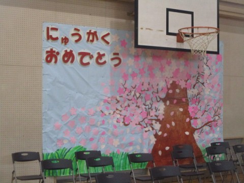 明日の入学式に向けて準備が整いました。校庭の桜も体育館の装飾も1年生が登校してくるのを待っています。