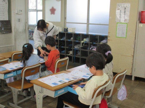 この時間は,ひらがなの学習をしていました。今日の文字は「ふ」です。形をとるのが難しい文字です。言葉集めなどに楽しく取り組み,集中して書くことができました。