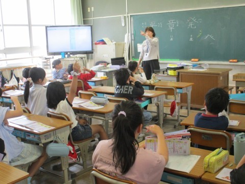 この時間は新出漢字を学習していました。3年生と4年生は新しく学習する漢字が非常に多い学年です。担任の先生が書き順を丁寧に説明したあと,みんなで書き順を確認していました。