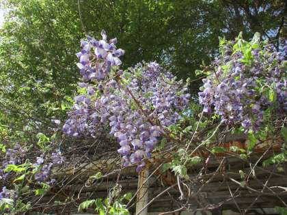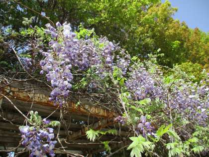 運動場にある藤棚では、薄紫色の藤の花が満開です。