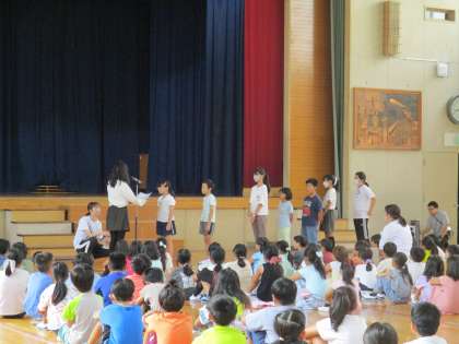校長先生からお月見にちなんだ「月」についての話がありました。次に生徒指導の先生から「あいさつ」が増えてきているので引き続きがんばろう、という話があり、児童会からは「あいさつコンクール」の表彰がありました。