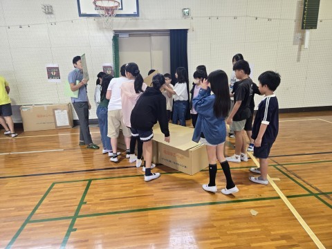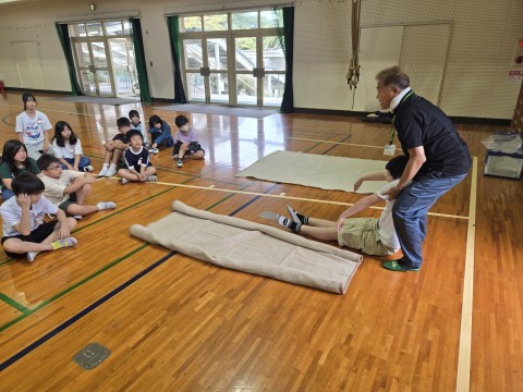 総合の学習では、防災学習に取り組みます。今日は、南区自治推進課の方に来ていただき、自助や共助について教えていただいたり、防災倉庫などについて学習を行いました。
