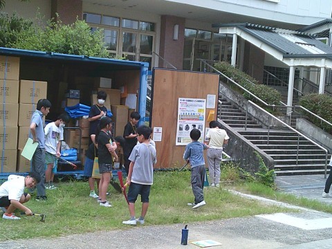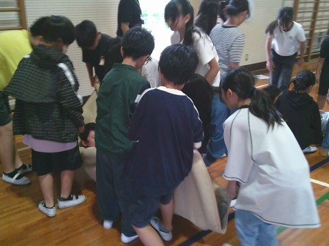 備蓄倉庫の中を見たり、毛布を担架の代わりにして、人を運ぶ練習をしたりしました。