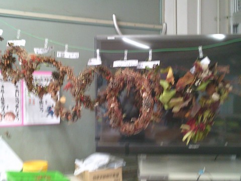 生活科で拾いに行った木の実や落ち葉もたくさんくっつき、オリジナルのリースに仕上がりました。