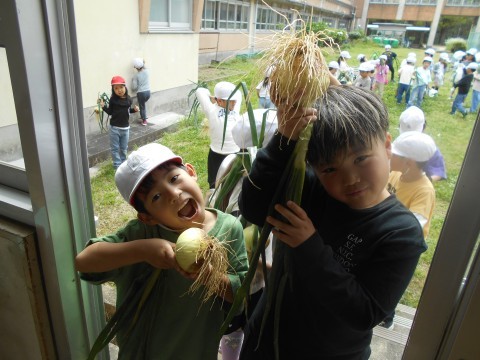 中庭から楽しそうな声が聞こえてきたのでのぞいてみると、2年生が1年生のときに植えていた玉ねぎの収穫を行っていました!