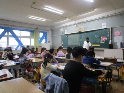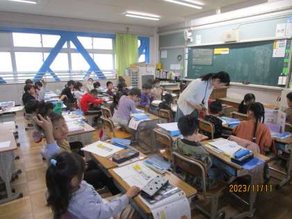 たくさんのおうちの人が見守ってくださる中、さくらんぼ計算の方法を使ったり、ブロックを使って、くりさがりのある計算をみんなで考えています。