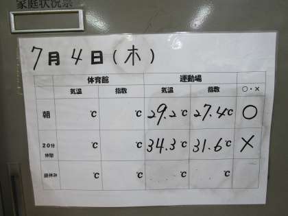 今日も保健委員会より水分補給を促す校内放送を行いました。朝は運動場に出て体を動かすことが出来ましたが、すぐに陽が照ってきて20分休けいからは運動場に出ることが出来なくなりました。午前中授業の日は学校で過ごす時間は短くても、気温が上がりやすい時間帯に下校することになります。時間割に関わらず十分な量の水分を持たせてあげてくださいますようお願いいたします。
