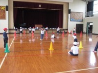 体育では,楽しそうに体を動かしていました。並べた輪に合わせて走ったり,ミニハード...