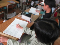 3年生の音楽の様子です。先生の持っているカードを見て、その通りにリズム打ちをします。とても集中してできていました。