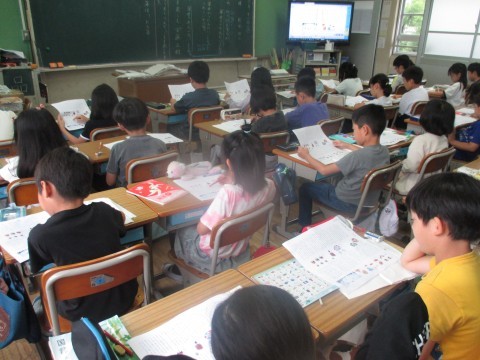 国語で、説明文「こまを楽しむ」の範読を聞いていました。本文を指で追ったりしながら、とても集中して聞くことができていました。