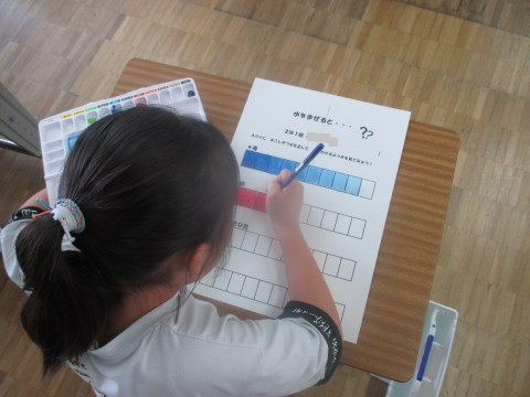 図工で色作りをしていました。絵の具に混ぜる水の量をだんだん多くしていくと、同じ色でも濃い色から薄い色まで、たくさんの色を作ることができました。