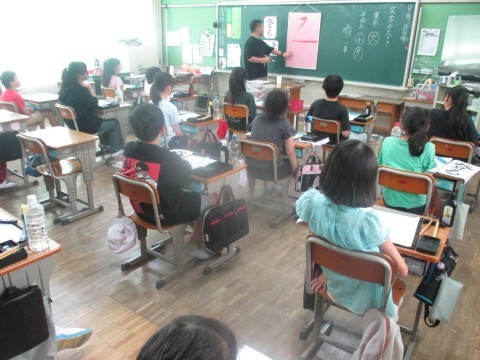 習字をしていました。今日の文字は、「登る」です。書き始める前に、先生が水黒板に書く手本を見ながら、毛筆で書く時に大事なことを確認していました。