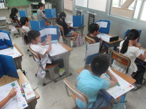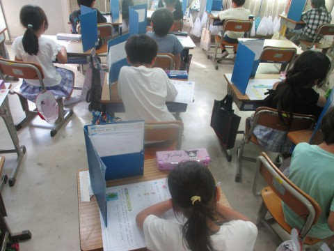 国語のテストをしていました。お話を読んで問題に答えたり、文字や言葉に関する問題を解いたりしました。