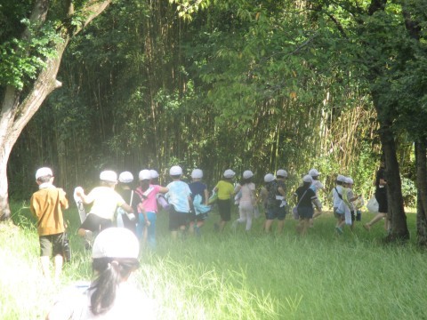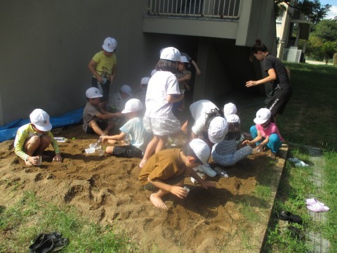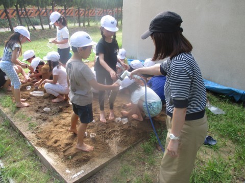 校庭の草むらを抜けた先にある砂場に行きました。どろんこ遊びをするためです。土の上ではだしになると、夢中で遊び始めました。「プリンできた!」「こっちに川作ろう!」と、思いつくままに楽しんでいました。