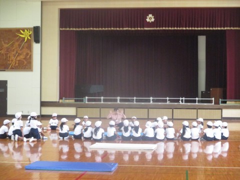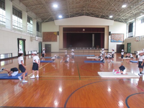 ようやく体育館も涼しくなりました。1年生が、体育でマット運動をしていました。後転をする時に大事なポイントをみんなで確認し、班に分かれて練習しました。