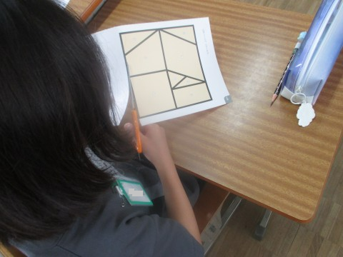 算数は、「かたち」の学習でした。学習に使う図形を、はさみで切り抜きました。いろいろな四角形や三角形がありました。
