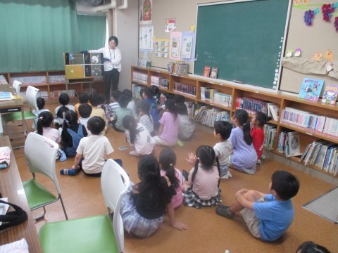 図書室で、読み聞かせをしてもらいました。大きな絵本を見ながら、お話の世界に入り込んでいるようでした。