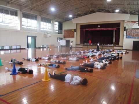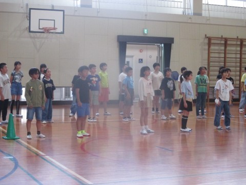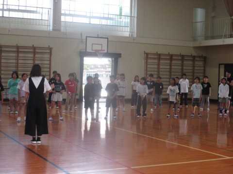 5年生と4年生が合同で、連合音楽会で発表する歌の練習をしていました。歌う前の発声練習では、床に寝転んで天井に向けて声を出しました。歌は、パート別に練習した後、みんなで合わせました。きれいな歌声が体育館に響いていました。