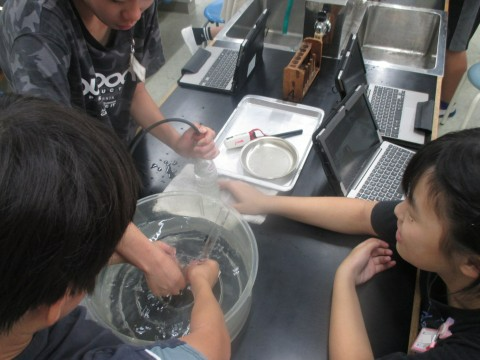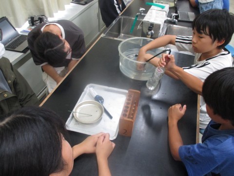 理科室で実験をしていました。今日は、炭酸水には何が溶けているかを調べます。班で協力して、炭酸水の中の気体を試験管に集めていました。