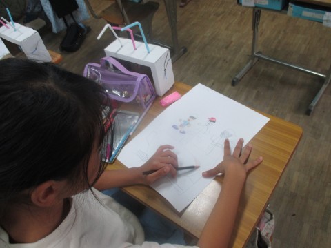 図工で、工作のアイデアスケッチを描いていました。動くことを想定して、どんなデザインにしたらいいかを考えていました。