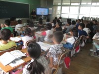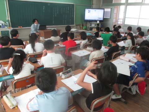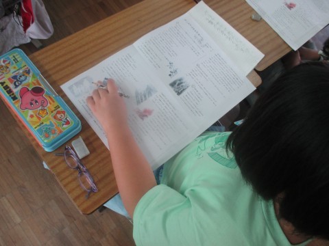 国語では、物語を読んでいました。登場人物や、どんな物語かを確認した後、場面分けをしました。どこで場面が変わると思うか、理由をつけて答えていました。